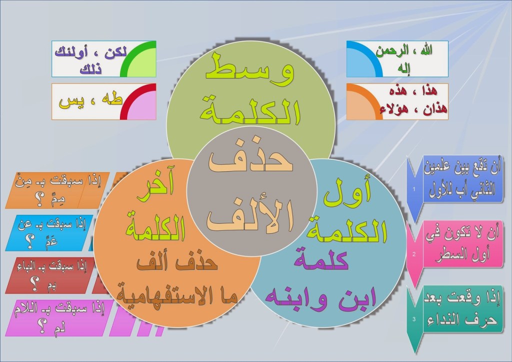 5- تحذف من لفظ الجلالة (الله)، و (إلـه) معرّفة أم غير معرّفة، كما تحذف من كلمة (الرحمن) معرّفة.