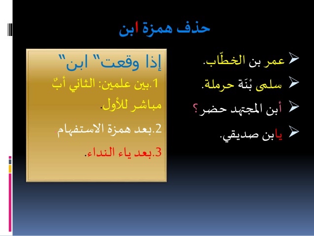 (تحذف همزة (ابن) و (ابنة) إذا وقعا بعد (يا) التي للنداء، نحو يا بن الذي دان له المشرقان، ويا بنة الحب الذي استبان).